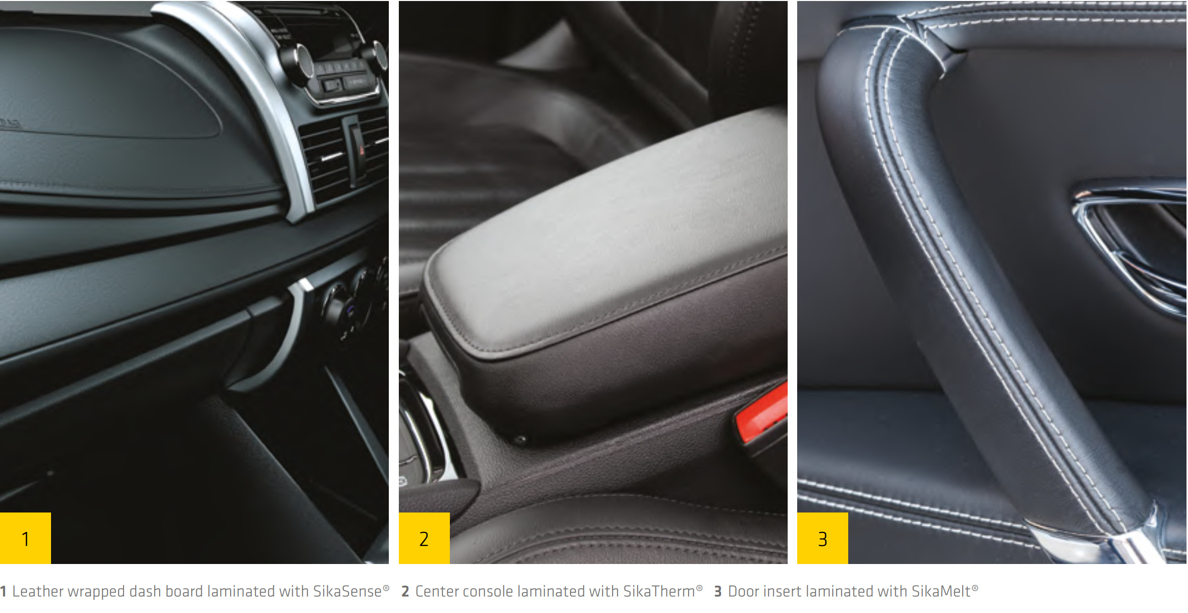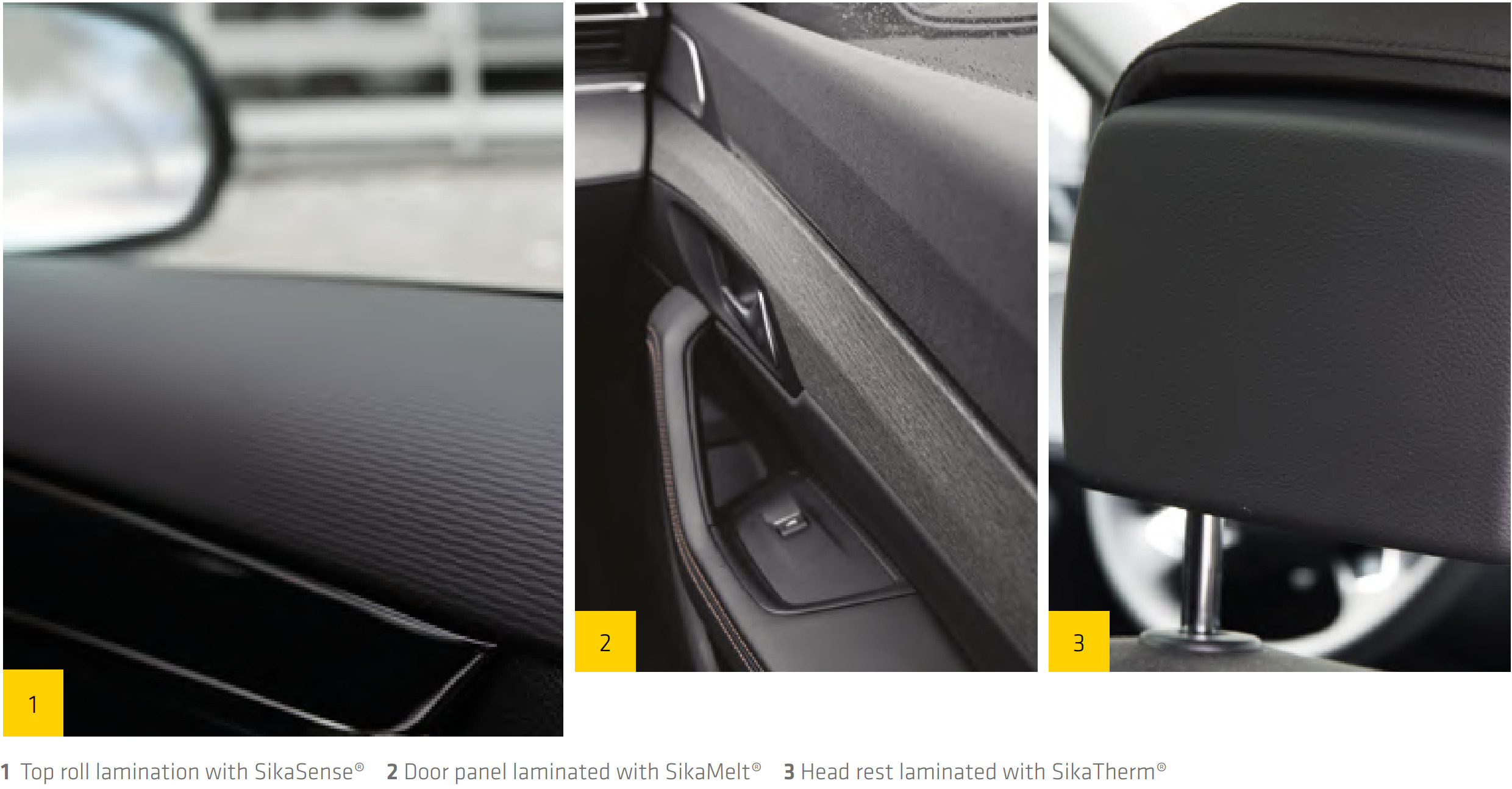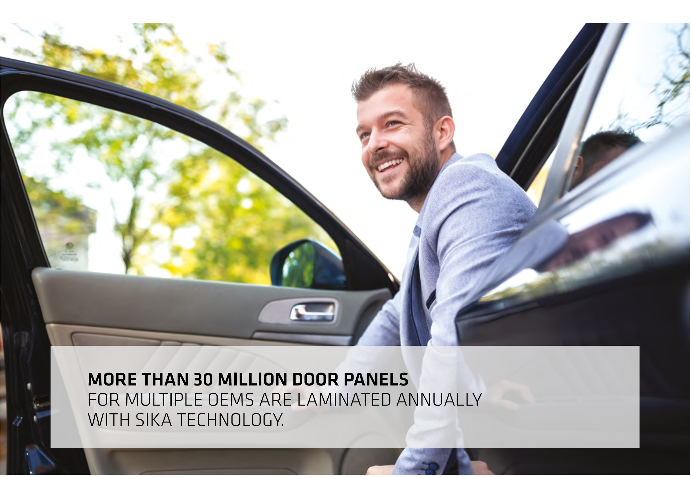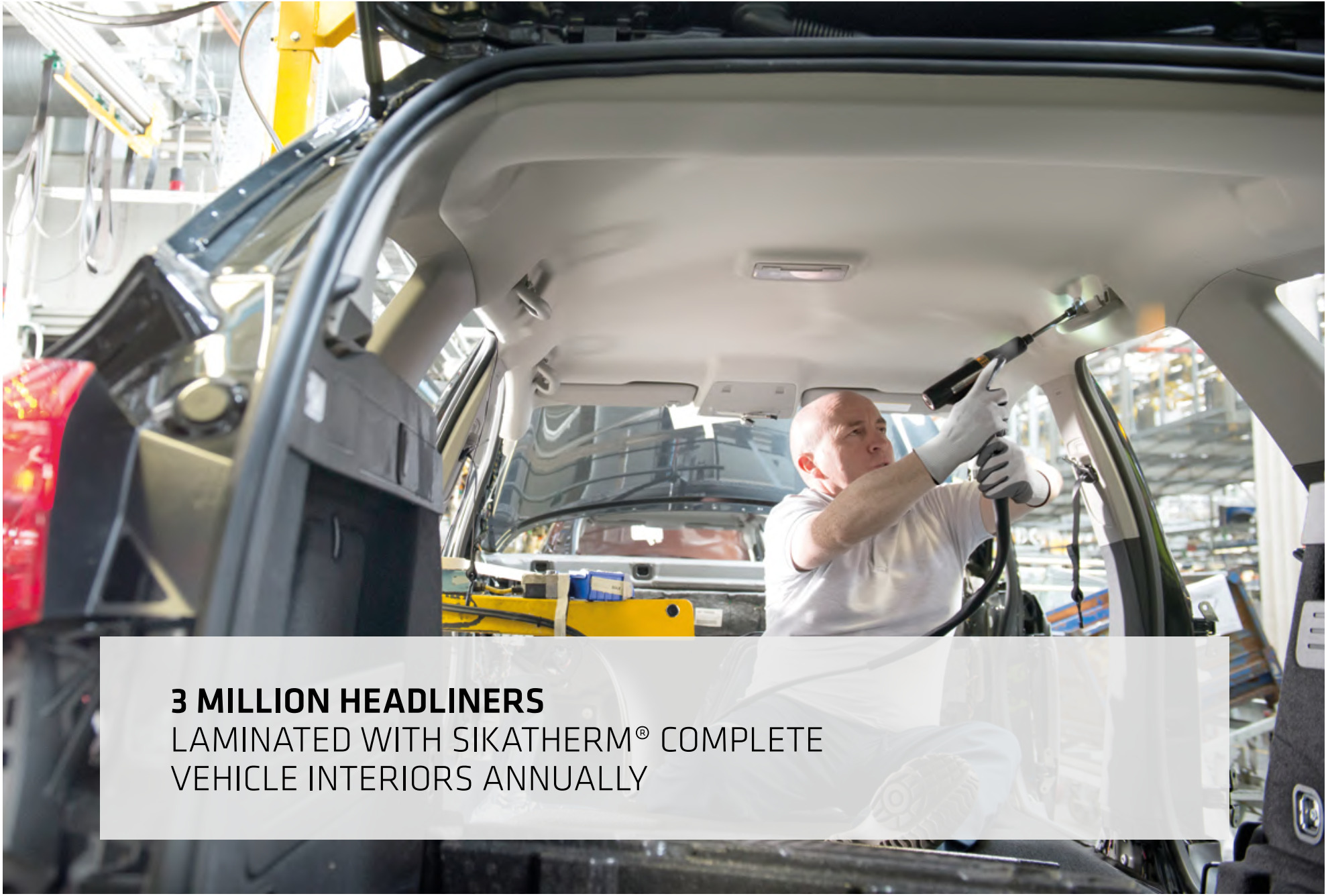 Over 30 million door panels and 3 million headliners annually are laminated with Sika technology. Complete portfolio from hotmelt (SikaMelt®) to water-based (SikaTherm®) systems — no pre-treatment needed on PP substrates.