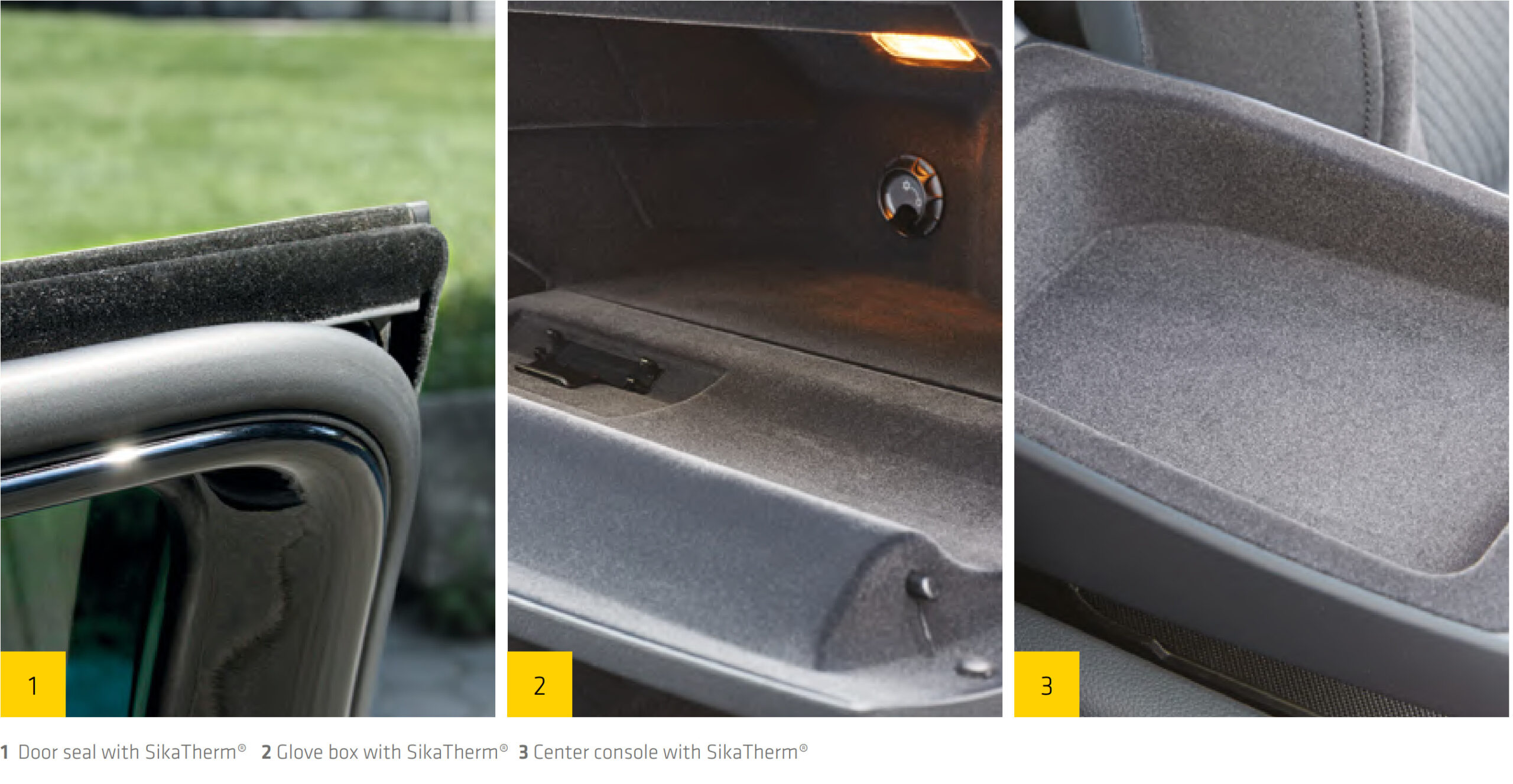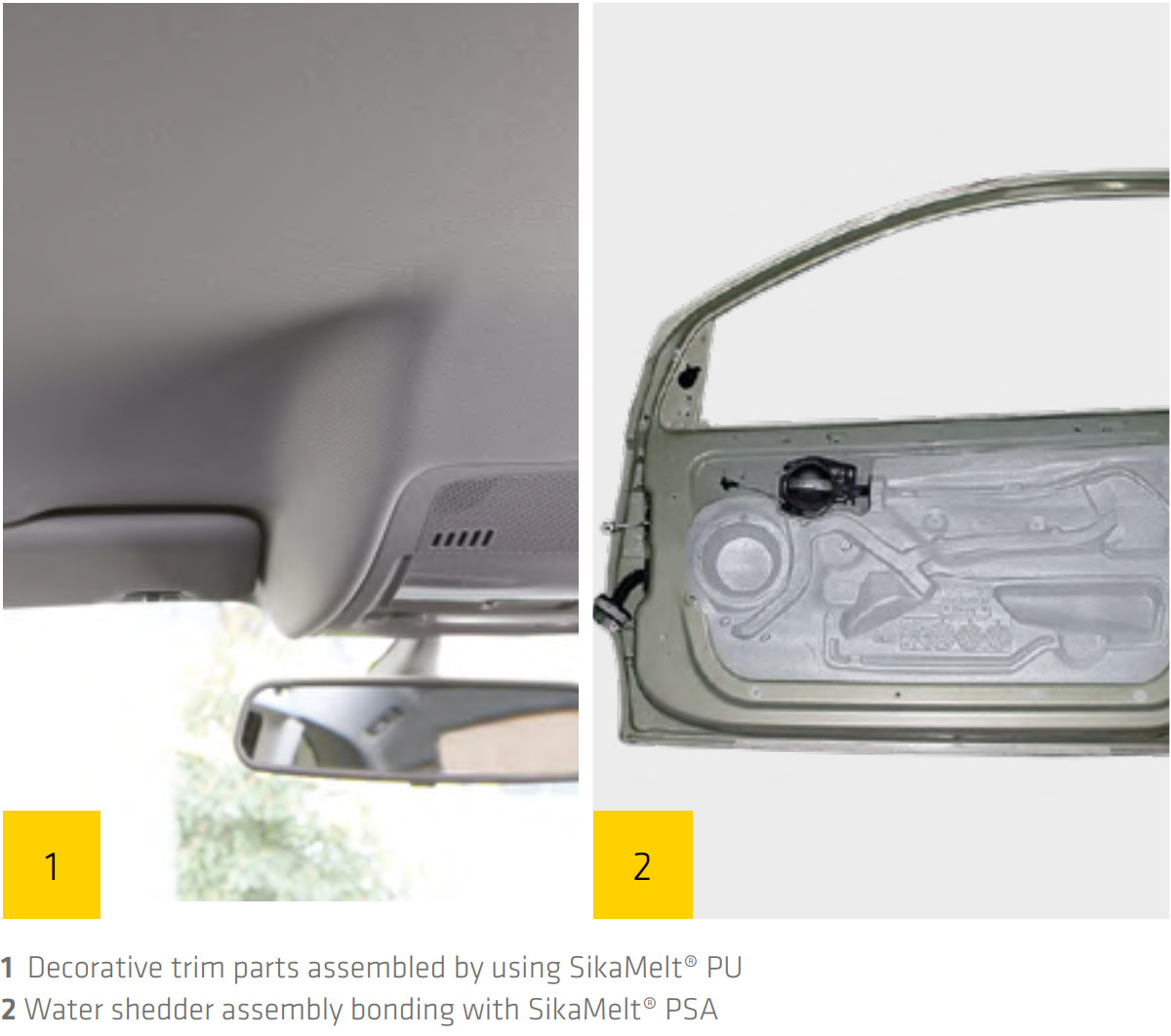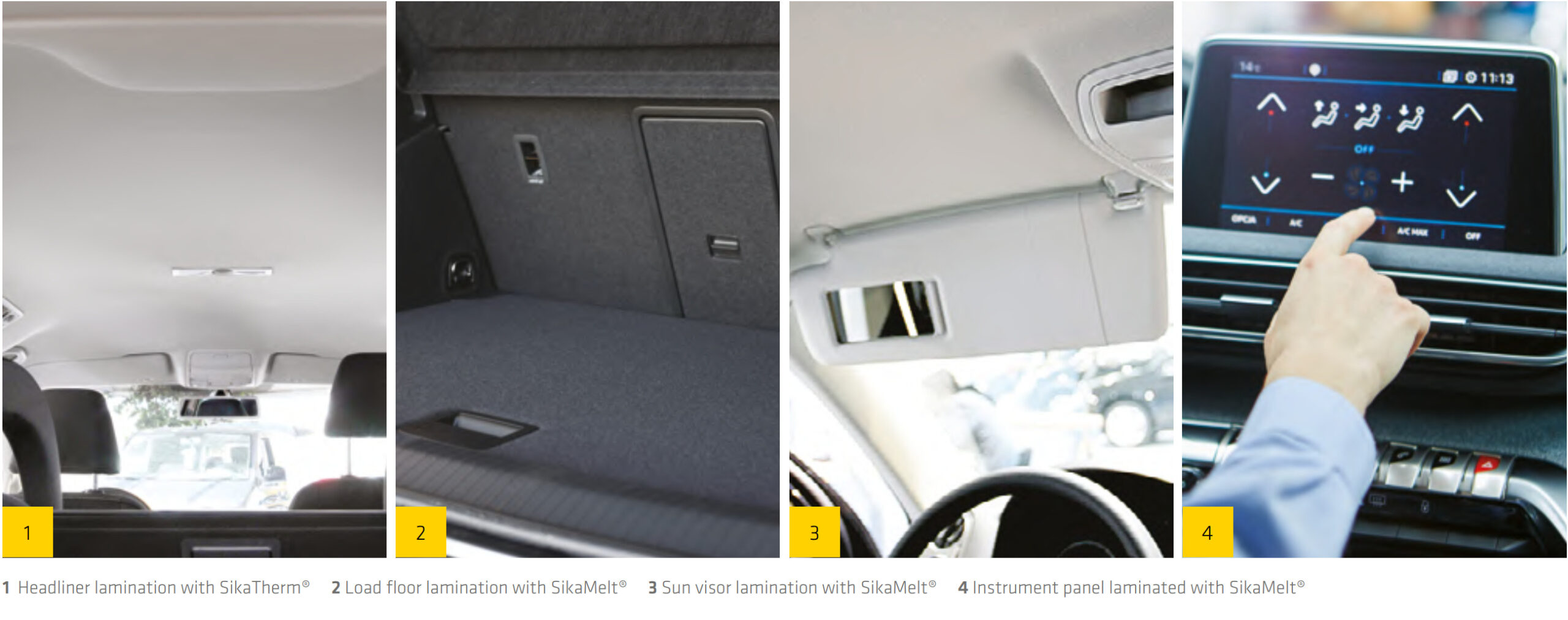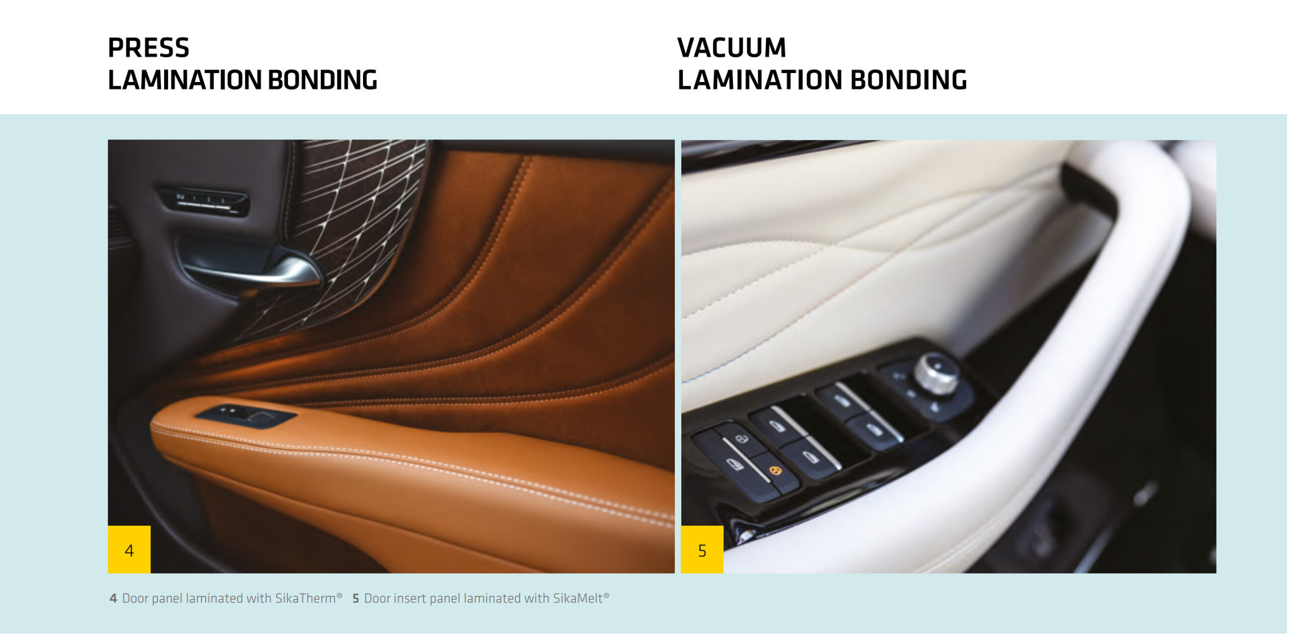 Over 30 million door panels and 3 million headliners annually are laminated with Sika technology. Complete portfolio from hotmelt (SikaMelt®) to water-based (SikaTherm®) systems — no pre-treatment needed on PP substrates.