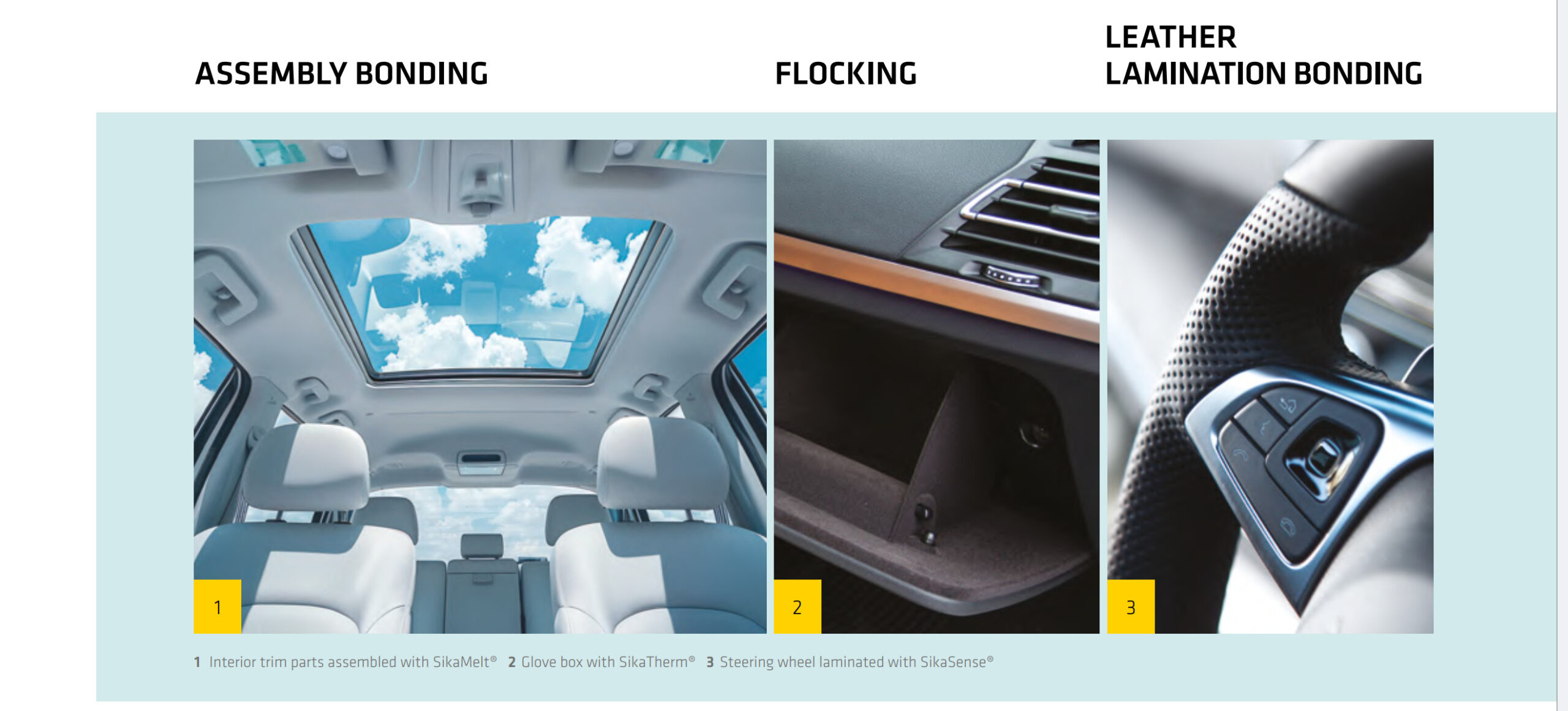 Every year, over 7 million steering wheels worldwide are leather-wrapped using Sika lamination technology. SikaTherm®-250 + SikaTherm®-015 Blue is the global standard — water-based 2C system, ultra-low VOC, meeting VDA 278 and strict aging tests from Hyundai, Kia, BMW, Mercedes-Benz.