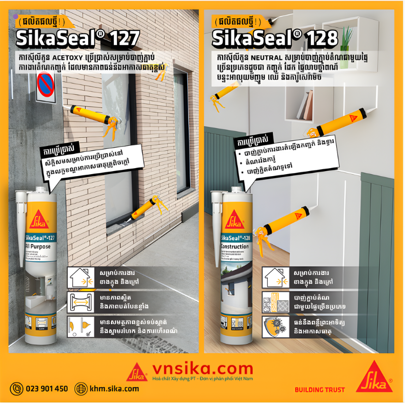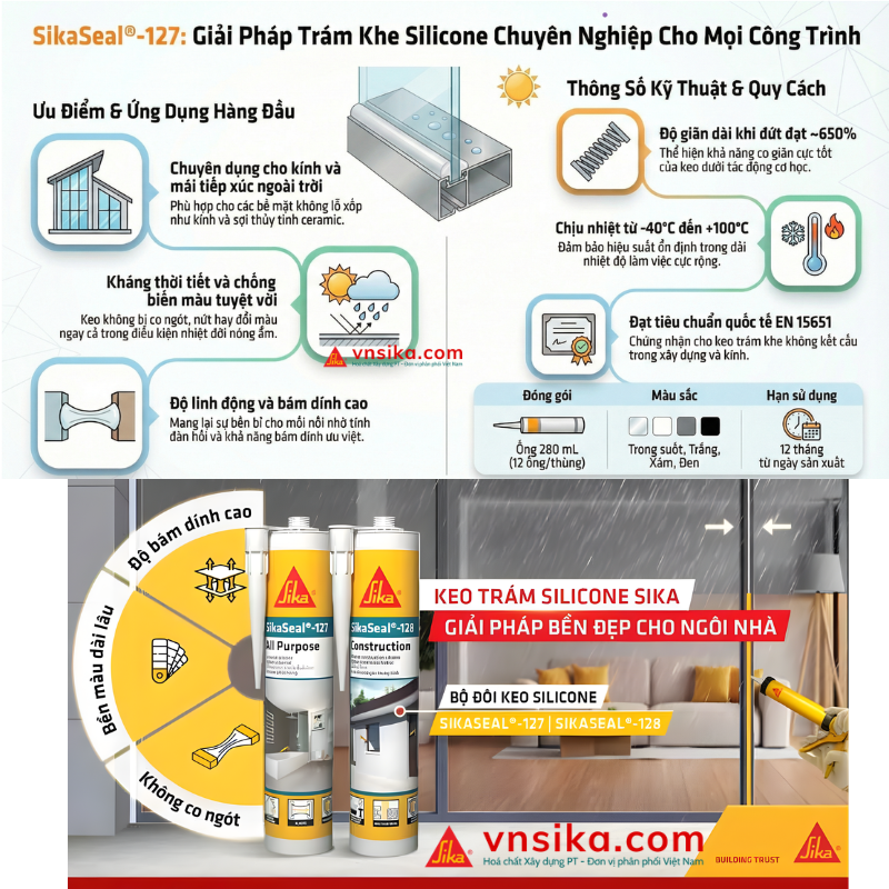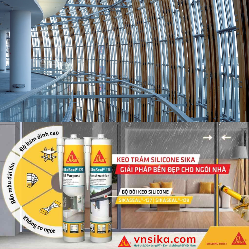 Khám phá SikaSeal 127 – keo trám khe silicone axetoxy chuyên dụng cho kính và mái. Chống tia UV, không co ngót, bám dính cực tốt trên nền không lỗ xốp.
